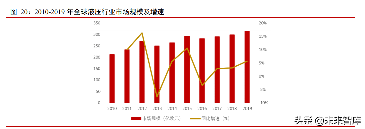 美、中液压市场规模共占全球的 2/3。 2019 年液压产品全球销售规模为 316 亿欧元, 同比增长 5.69%,年复合增长率为 4.53%,增速较为缓慢。美国和中国液压行业市场规 模分别占全球市场的 38%、30.2%,位列前二,远超于日本及欧洲多国。日本、德国、 意大利分别占比 9.3%、6.7%、5.6%。2019 年国内液压工业总产值为 614 亿元,同比增 长 7.55%。