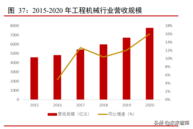 2015-2020 年国内工程机械销量和行业营收规模都呈上升趋势。 2015-2020 年销量年复合增长 20.49%,营收规模年复合增长 11.14%。2020 年工程机械销量约为 932 万台, 同比增长 19.24%;行业营收规模为 7751 亿元,同比增长 10.02%。2020 年的较高增长主 要是疫情后基建和房地产行业复苏,基建、房地产固定资产投资持续增高拉动行业需求。
