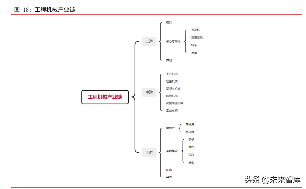 工程机械产业链上游由原材料钢 材和发动机、液压系统、轴承、底盘等核心零部件组成。 中游为工程机械厂商,下游应 用主要包括房地产、基础建设项目、矿山等。以挖掘机为例,核心零部件占据成本的 45%, 钢材和其他零部件分别是成本占比的 20%、27%,共占一部挖掘机成本的 92%,上游产 业链对于工程机械影响较大。制造费用仅占据成本的 8%。