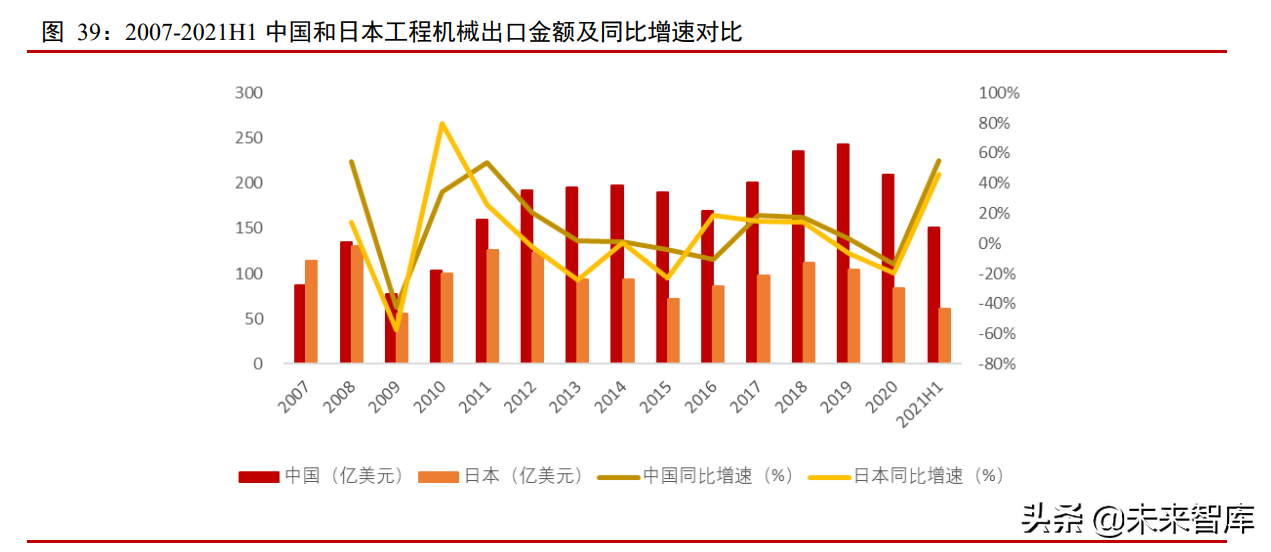 2020 年工程机械出口表现欠缺,2021H1 出口金额大幅上升。 出口方面,2008 年中 国工程机械出口金额超越日本。2009-2020 年两国出口金额趋势相同,整体呈上升趋势。 同时中国逐渐拉开与日本的差距,2013-2021H1 中国工程机械出口金额均为日本的 2 倍。 2020 年较 2019 年出口金额稍有回落,中国和日本分别出口金额为 209.68 亿美元、83.82 亿美元,分别同比下降 13.68%、19.71%。2021H1 中国和日本分别出口金额为 150.71 亿 美元、61.33 亿美元,分别同比增长 54.90%、45.98%。