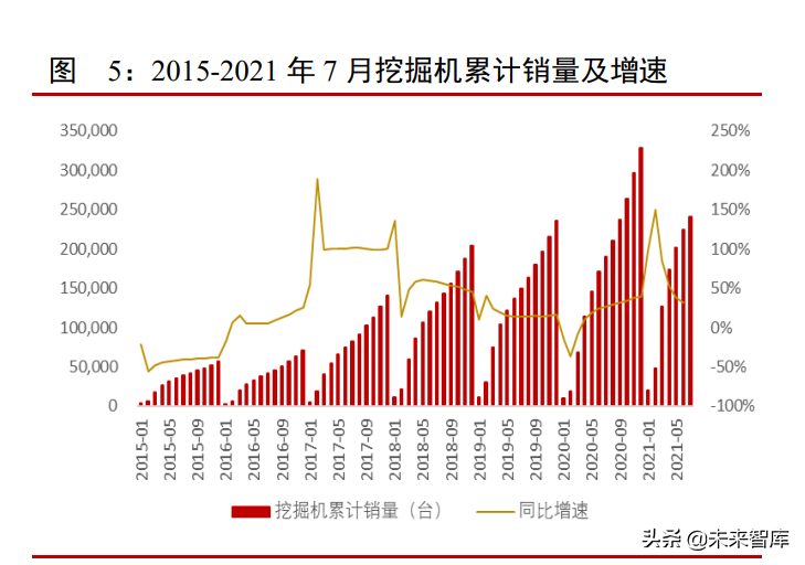 挖掘机作为工程机械的主要产品,出口销量表现亮眼。 2015-2021 年 7 月,挖掘机 出口销量逐渐上升。2021 年 4 月挖掘机市场步入淡季,而海外保持销量高速增长,主要 是海外需求的持续复苏。2021 年 1-7 月年挖掘机出口势头强劲,我们认为 20201Q4 出口 销量将延续高增长态势。