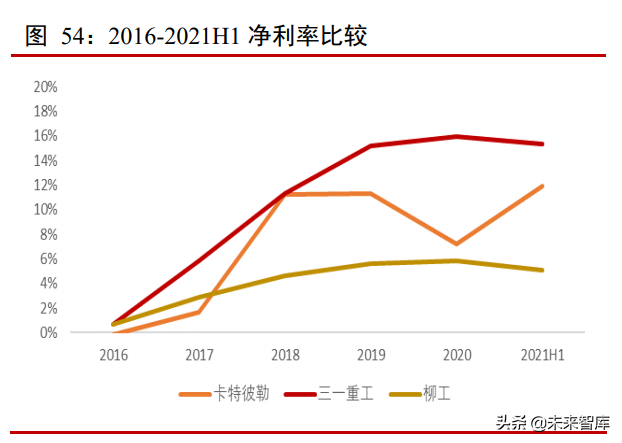 2016-2020 年卡特彼勒净利率波动较大。 2020 年卡特彼勒毛利率为 7.19%,同比下 降 4.14pct。2016-2020 年三一重工净利率保持上升趋势,同时三一重工净利率保持在卡 特彼勒和柳工之上。2020 年三一重工净利率为 15.97%,同比提升 0.78%;2021H1 净利 率为 15.34%,同比下降 2.22pct。柳工 2020 年净利率为 5.58%,同比提升 0.25pct;2021H1 净利率同比下降 0.86pct 至 5.07%。