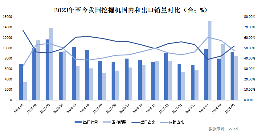 据报道,从数据来看,自2023年5月起,我国挖掘机月度出口销量高于国内销量,连续10个月保持占比50%以上,2023年全年累计销量也是出口大于国内。不过,进入2024年后,海外需求阶段性承压,3月、4月国内销量反超出口销量,但5月出口销量再次超越国内销量。尽 管5月出口挖掘机9306台,同比有所下滑,但高端、大吨位产品出口依旧保持向上态势。