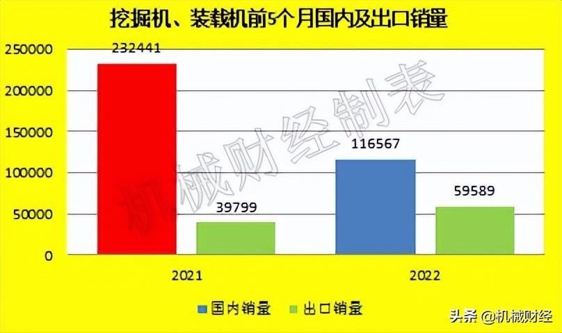 2022年1-5月,共销售挖掘机122333台,同比下降39.1%;其中国内80097台,同比下降54.7%;出口42236台,同比增长75.7%。
