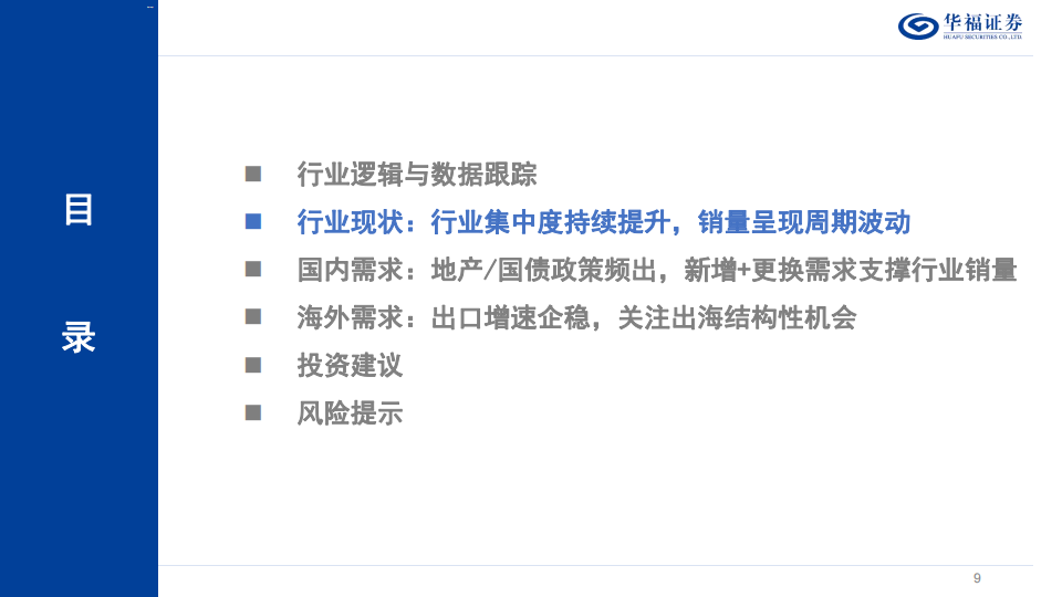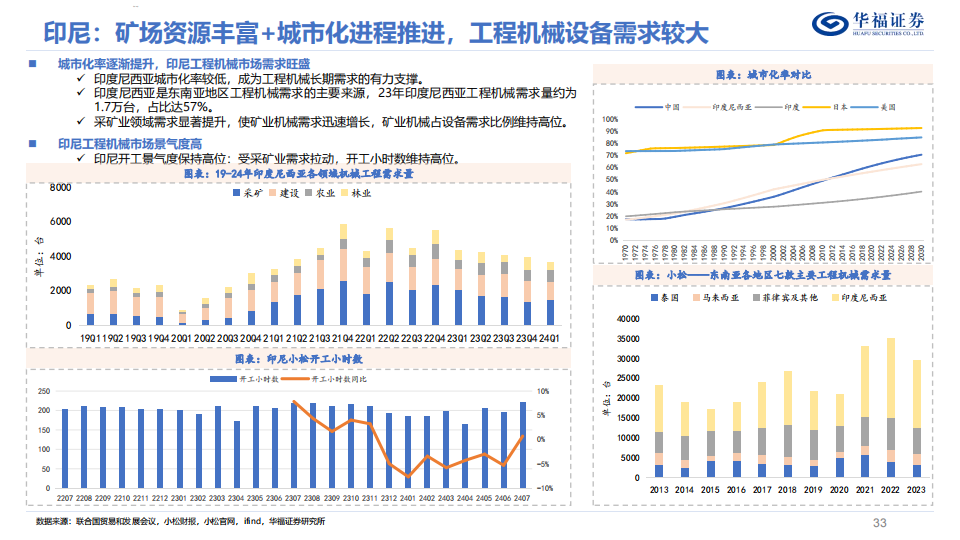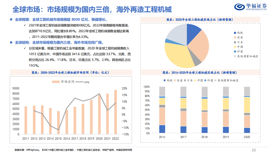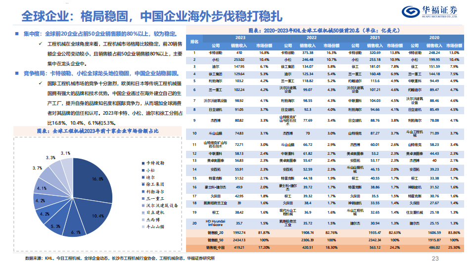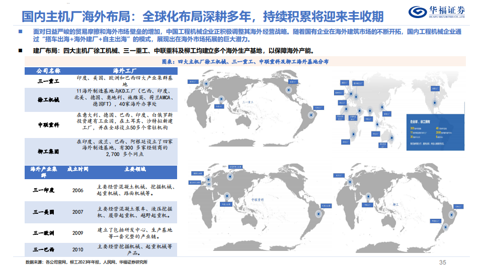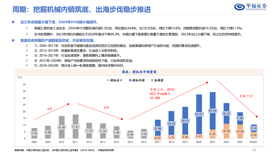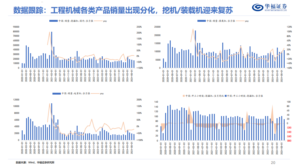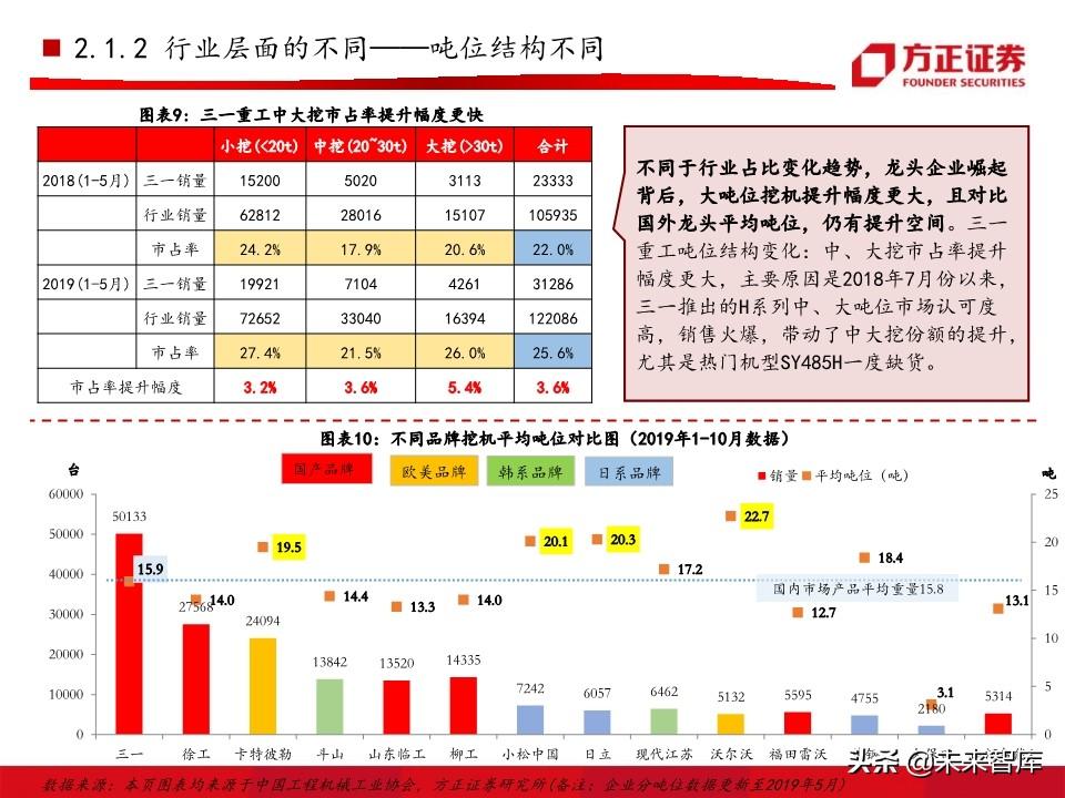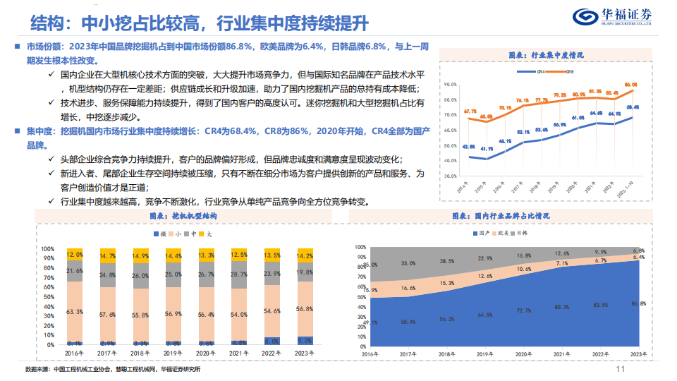 从行业层面表现来看:1) 本轮复苏周期持续时间更久,且景气度仍在延续;2)吨位结构方面 向两头发展(小挖、大挖),中挖销售绝对量及品类占比均在萎缩;3)三一、徐工等国内龙 头企业领衔国产替代,国产品牌已然崛起。