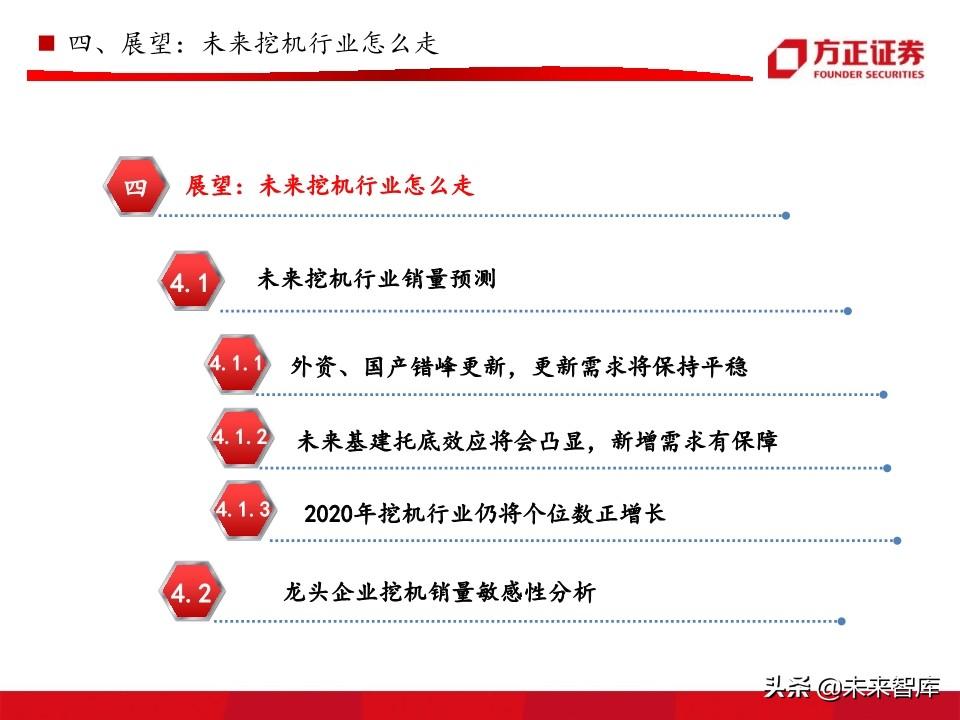 展望未来,挖机行业仍有望不俗表现,龙头企业α属性进一步凸显。 政策托底&机器换人带来 的新增需求+国产机全球化加速带来的出口需求+使用寿命&环保趋严带来的更新需求,2020年 挖机行业有望保持个位数以上正增长,龙头企业则依靠创新驱动,建立更深的品牌护城河,蓄 力上行。