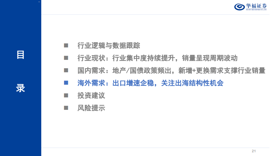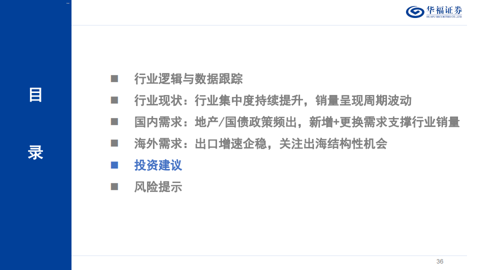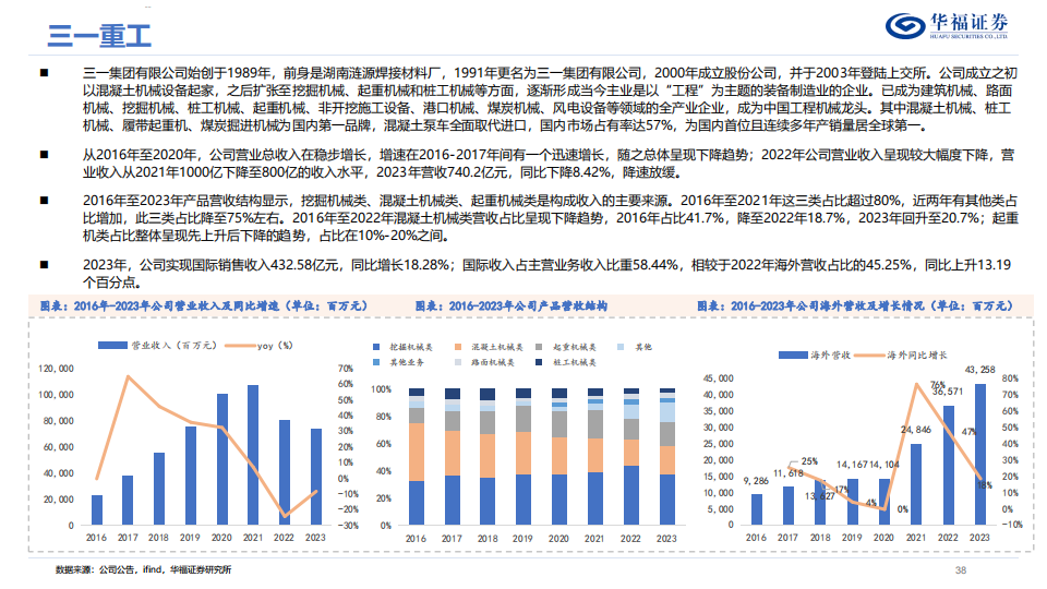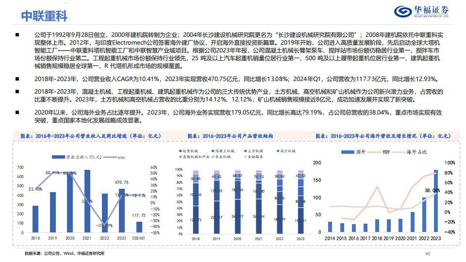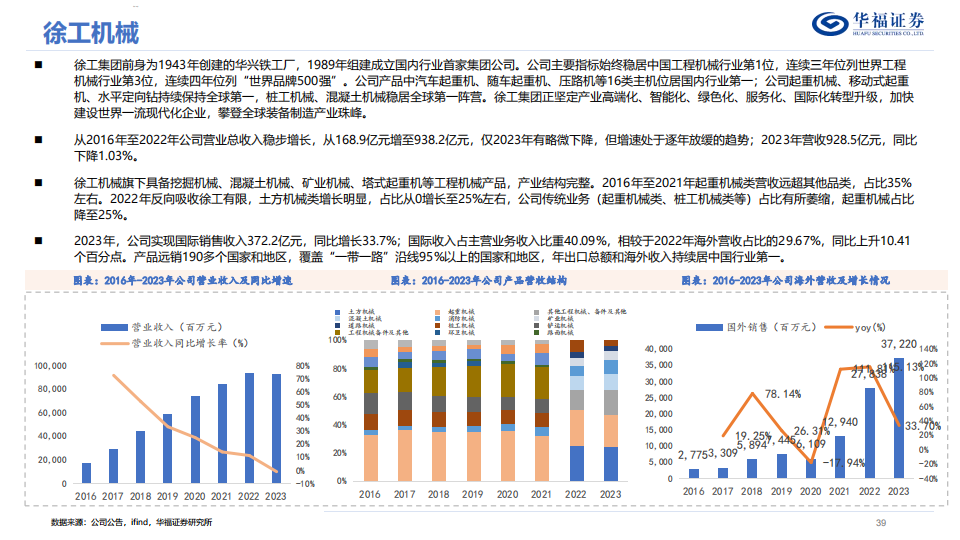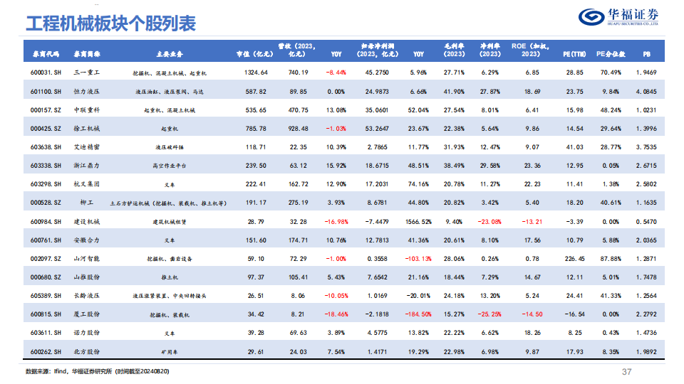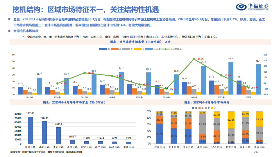 1\ 行业深度调整第四年,工程机械行业筑底有望复苏、企业营收业绩边际企稳。随着存量市场+增量市场+海外市场三方面的发力,预期在2024年行业窄幅波动, 国内企稳,海外整体出口增速企稳,缓慢复苏值得期待,关注结构性机会:产品、出海、利润修复。