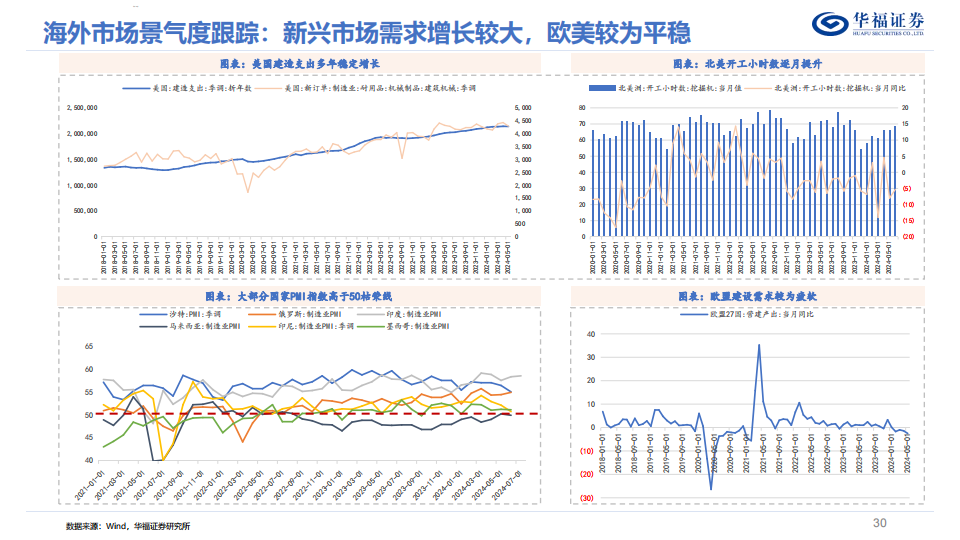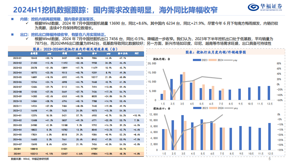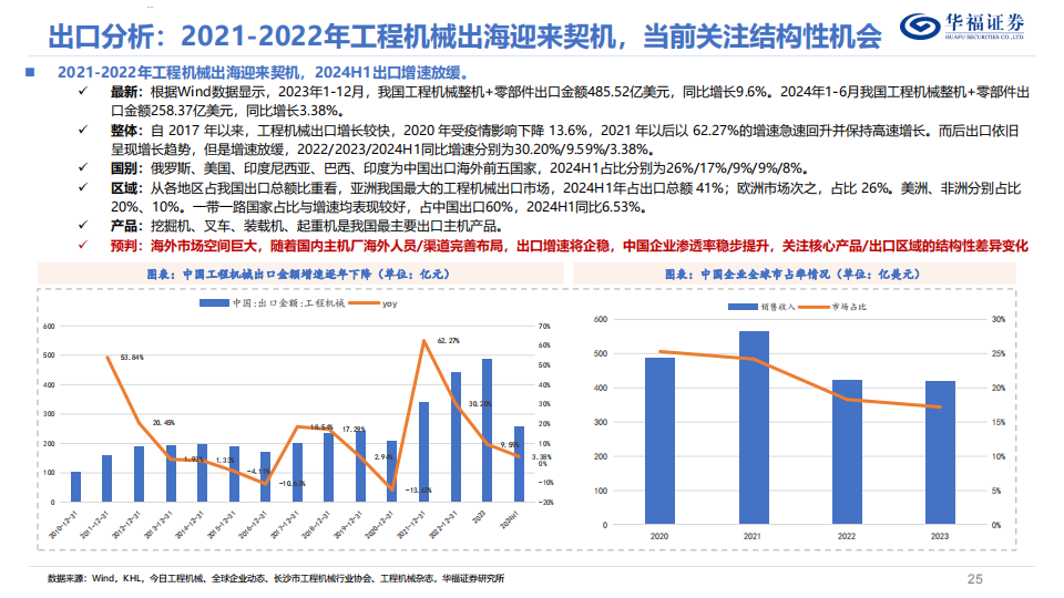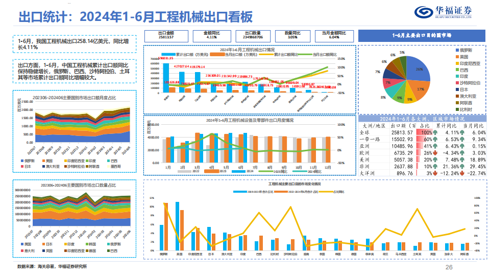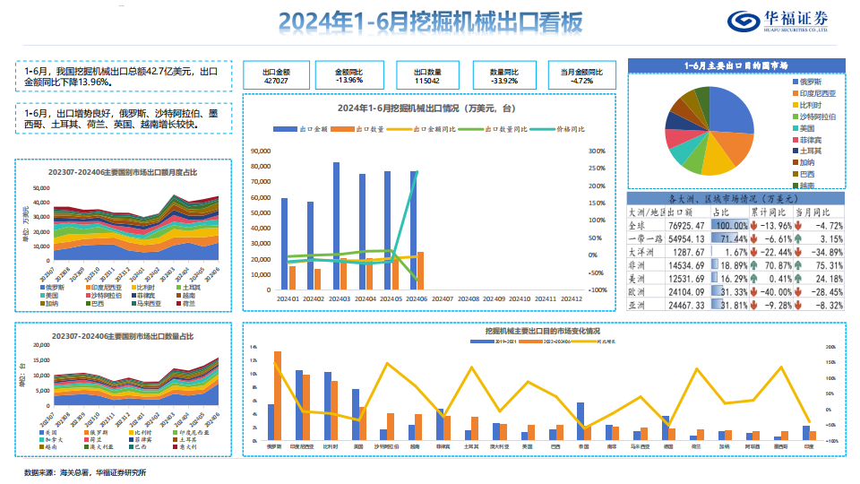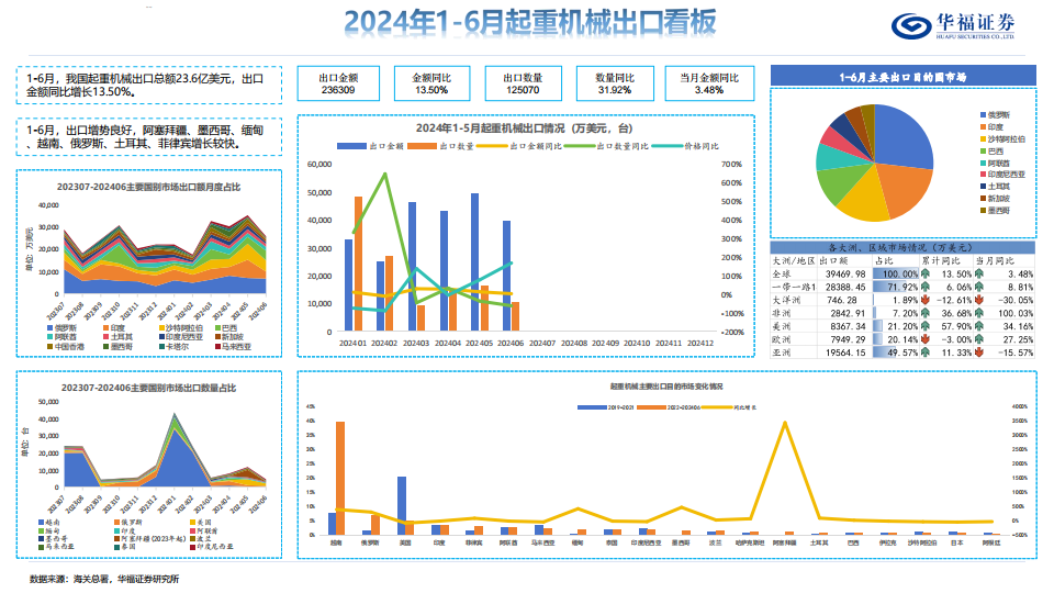 4\ 海外需求:2024年1-6月我国工程机械整机+零部件出口金额258.37亿美元,同比增长3.38%,出口增速逐年回落,关注出海结构性机会。