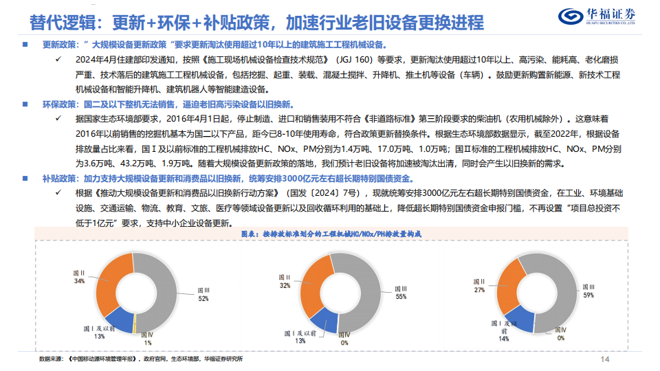 1、外资品牌和国产品牌错峰更新,更新需求不会大幅下滑。 目前存量设备中,国二设备保有量 、污染物排放量均占比最高,未来是更新换代的主产品。