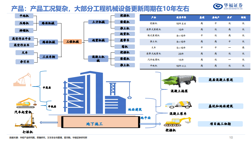 3、出口需求仍不断创新高。 2010年国内挖掘机出口占比仅1.7%,到2019年1-10月出口占比提升至 11%。近十年来,尽管不同年份有波动,但这个比例总体上稳中有升,而出口需求也是这一波 周期持续性超过以往任何阶段的主要原因之一。随着各大主机厂海外渠道布局完善,逐步进入 收获期,出口占比仍有望不断提升。